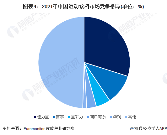 目前我国主要的运动饮料品牌包括健力宝、佳得乐、宝矿力。根据Euromonitor的数据,2021年中国运动饮料市场中,健力宝市场占比达到了29.9%,为运动饮料行业市场规模最大的品牌,其次为百事,市场规模占比达到了10.7%,再次为宝矿力,市场规模占比为5.1%。