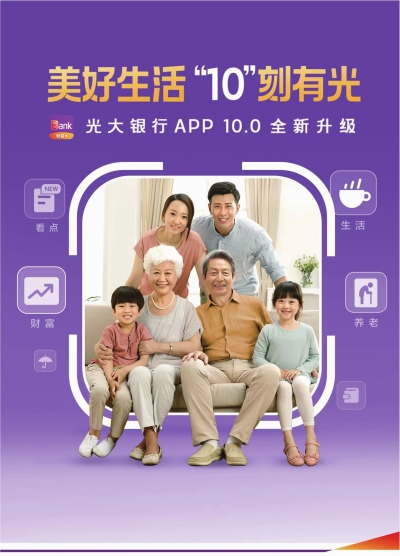 当下,构建移动端APP金融生态的重要性不言而喻。作为客户经营的主要阵地之一,光大银行APP的功能不断优化,并通过一系列的增值服务提升客户体验。今年12月,光大银行APP正式推出10.0版本,以“开放服务模式、专业财富管理、智享数字服务、陪伴客户成长”作为建设理念。一方面,新版本的五大基础页面及重点财富页面均进行视觉焕新升级,风格轻盈明快,板块布局更清晰、产品更全面、内容资讯更专业、生活服务更贴心、个人页面更直观;另一方面,全面升级“理财”“社保”“贷款”“缴费”四类一站式综合服务,覆盖生活缴费、理财购买、社保缴纳、消费金融、市民服务等众多领域,让金融服务更加亲民、便民、惠民。