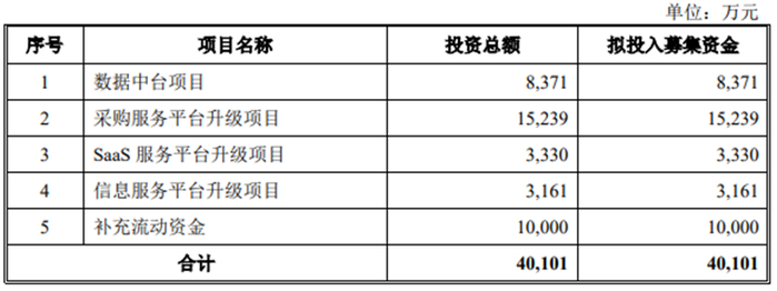 电子网拟募集资金40,101万元,用于数据中台项目、采购服务平台升级项目、SaaS服务平台升级项目、信息服务平台升级项目、补充流动资金。