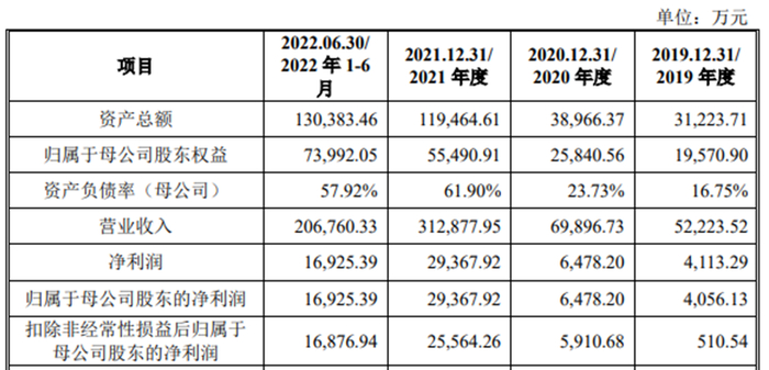 2019年至2022年1-6月,电子网的营业收入分别为52,223.52万元、69,896.73万元、312,877.95万元和206,760.33万元;净利润分别为4,113.29万元、6,478.20万元、29,367.92万元和16,925.39万元;归属于母公司股东的净利润分别为4,056.13万元、6,478.20万元、29,367.92万元和16,925.39万元;扣除非经常性损益后归属于母公司股东的净利润分别为510.54万元、5,910.68万元、25,564.26万元和16,876.94万元。