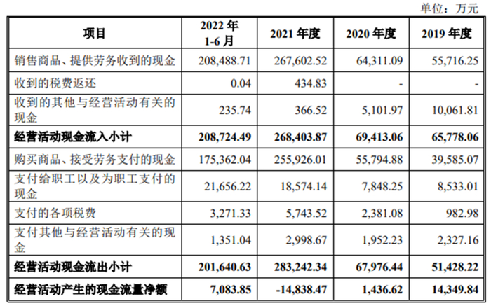 上述同期,公司销售商品和提供劳务收到的现金分别为55,716.25万元、64,311.09万元、267,602.52万元和208,488.71万元;经营活动产生的现金流量净额分别为14,349.84万元、1,436.62万元、-14,838.47万元和7,083.85万元。