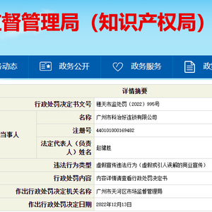 中国质量新闻网讯 2022年12月13日,广州市天河区市场监督管理局发布行政处罚决定书 穗天市监处罚〔2022〕995号。涉及广州市科治好连锁有限公司虚假宣传违法行为(虚假或引人误解的商业宣传)案。具体信息如下: