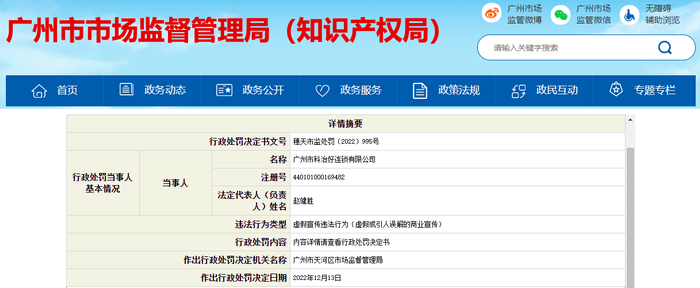 罚款21万元!广州市科治好连锁有限公司因虚假宣传违法行为(虚假或引人误解的商业宣传)被处罚