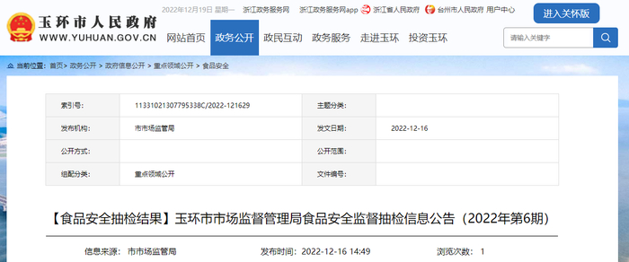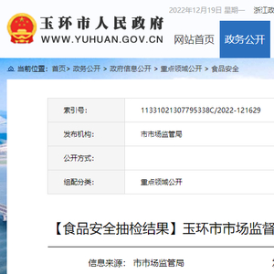 中国质量新闻网讯 近日,浙江省玉环市市场监督管理局发布食品安全监督抽检信息公告(2022年第6期)。