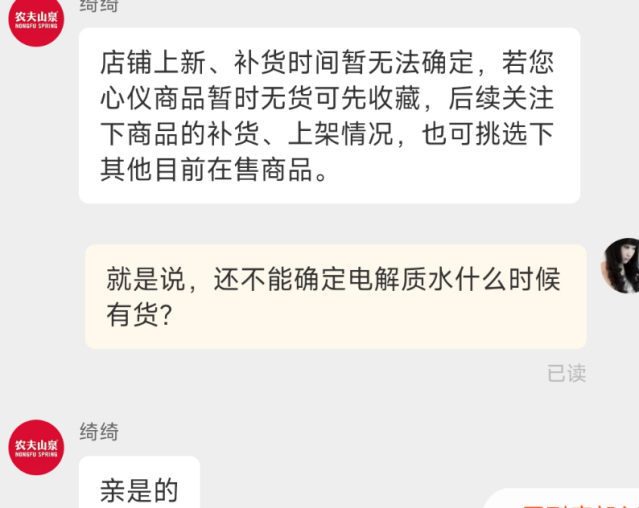 每经记者以消费者身份询问农夫山泉电解质水的到货时间,得到的答案是“无法确定” 。