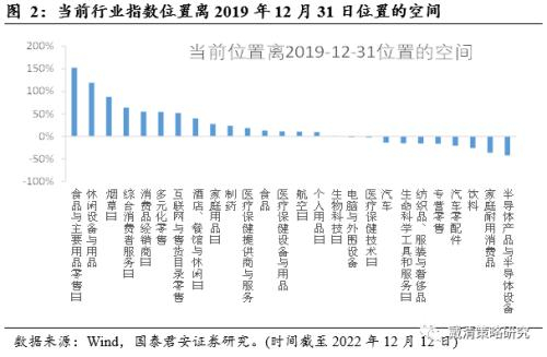 从上述政策的边际变化中不难看出,在出口承压、投资力度有限的情况下,2023年消费将是推动国内经济从供给端到需求端修复的主要引擎之一;另外,地产供给端有政策托底,仍有一定的修复空间;对平台经济的监管放松主要意义在于释放更多就业机会,同时吸引部分外资投资,其根本目的是提振居民收入预期和消费能力。因此,在促消费、保地产、稳就业主线下,或可围绕消费链和地产链构建逆境反转策略。
