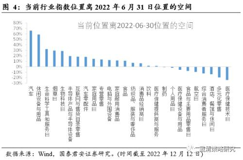 在疫情后,多数行业指数离2022年的2月15日和6月30日的行业指数点位仍有不少的空间。Wind港股三级行业中,休闲设备与用品(72.6%),汽车(52.2%),家庭耐用消费品(40.4%),汽车零配件(30.4%),电脑与外围设备(29.3%),互联网与售货目录零售(27.9%),专营零售(27.1%),纺织品、服装与奢侈品(26.3%),食品(25.9%),生物科技(22.6%)等行业均离2022年2月中旬的位置有超过20%以上的空间。