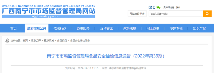 南宁市市场监督管理局发布2022年第39期食品安全抽检信息