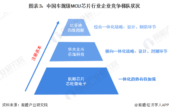 我国车规级MCU芯片行业竞争梯队从战略角度可分为三类,一类是资金实力雄厚的实行综合一体化战略的企业,如比亚迪和四维图新等,通过横向+纵向一体化战略,布局车规级MCU芯片的关键设计和制造环节;一类是资金实力相对充足,通过横向一体化战略进入行业或者拓展业务的企业,如华大北斗和芯海科技等;一类是目前资金有限,用于发展和扩大自身业务规模,尚未真正实行一体化战略的企业,如航顺芯片和芯旺微电子等。