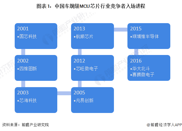 从我国车规级MCU芯片行业主要竞争者的入场进程来看,国芯科技的成立时间最早,于2001年便成立;四维图新、芯海科技两家企业,均在2010年成立开展业务。华大北斗和赛腾微电子的成立时间较短。