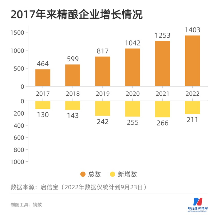 截至今年9月23日,国内含精酿啤酒业务(注1)的公司(存续)总数为1403家,其中211家为今年新增。这是疫情之前——即2019年(817家)的1.72倍。