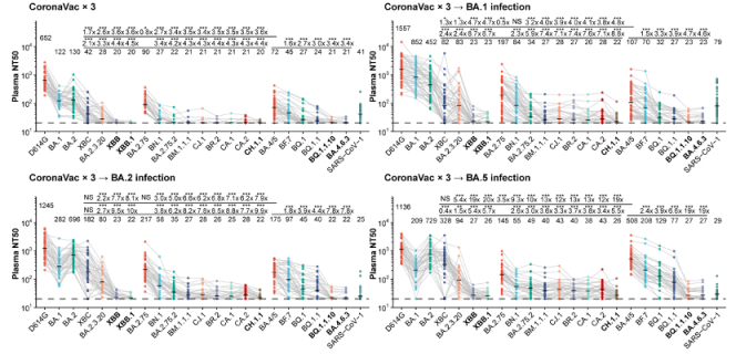 血浆中和数据也显示,XBB,CH.1.1和BQ.1.1.10(或BQ.1.18)等毒株不仅逃逸了三针灭活疫苗接种者的血浆,也几乎完全逃逸奥密克戎BA.1/BA.2/BA.5突破感染者的血浆样本,显示出极大的免疫逃逸能力(图4)。