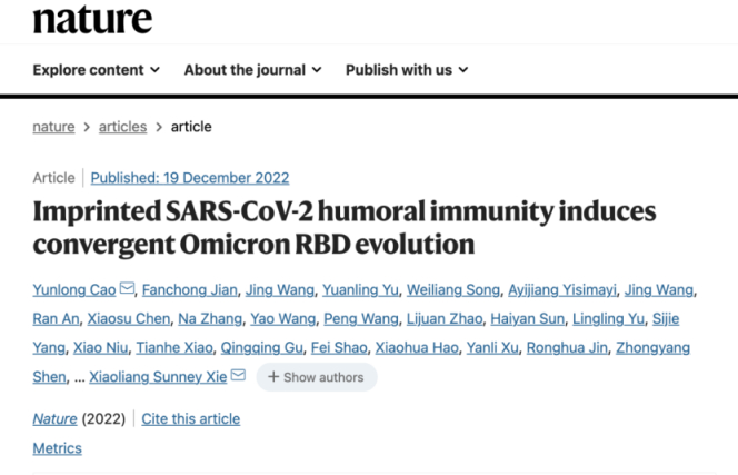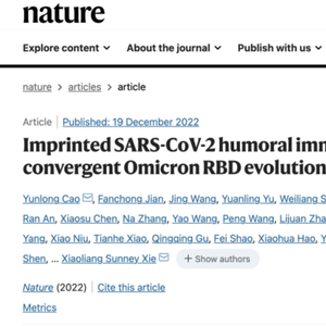 北京大学生物医学前沿创新中心(BIOPIC)、北京昌平实验室曹云龙/谢晓亮课题组联合中国食品药品检定研究院王佑春课题组于2022年12月19日在《自然》杂志在线发表了题为“Imprinted SARS-CoV-2 humoral immunity induces convergent Omicron RBD evolution”的研究论文,系统地探究了新冠病毒受体结合域(RBD)”趋同演化“的机制,并前瞻性地对病毒未来突变演化方向进行了预测,为广谱疫苗和抗体药物的设计与研发提供了宝贵的理论与数据支持。