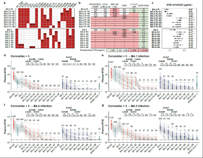 另外,研究人员基于BA.2.75和BA.5突变株的预测进化趋势,设计了携带不同RBD和NTD预测突变组合的假病毒(图7a),并测定了这些假病毒对不同中和抗体药物和血浆样本的中和情况及ACE2亲和力(图7b-g),结果显示,对BA.5或BA.2.75突变株最少引入5个突变就可以逃逸包括BA.5突破感染者在内的不同免疫状态下的几乎所有血浆样本。并且合成的假病毒与之后真实世界流行的BQ.1.1支系,CH.1.1支系等高度相似,验证了预测模型的准确性。