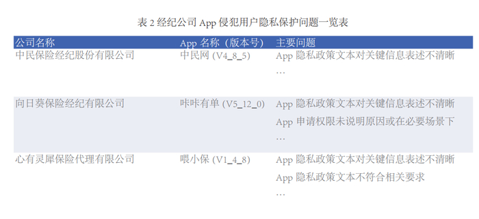 值得注意的是,在报告中列出的保险经纪公司APP侵犯用户隐私保护问题一览表中,中民保险经纪股份有限公司(以下简称“中民保险经纪”)、向日葵保险经纪有限公司(以下简称“向日葵保险经纪”)、心有灵犀保险代理有限公司(以下简称“灵犀保代”)分居前三,分属各公司APP分别为中民网、咔咔有单、喂小保。