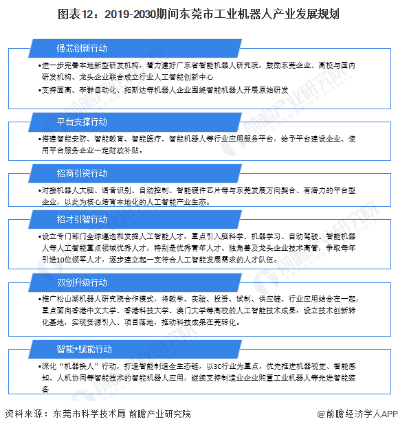 2019-2030年期间,东莞市将从“六项行动”发展工业机器人产业:强芯创新行动着力建好广东省智能机器人研究院;平台支撑行动给予平台建设企业、使用平台服务企业一定财政补贴;招商引资行动对接机器人相关企业培育相关生态;招才引智行动吸引专门人才;双创升级行动推广松山湖机器人研究院合作模式,促进产学研融合;智能+赋能行动深化“机器换人”,推广机器人应用。