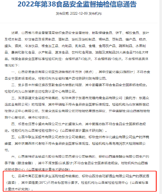 酒业内参查阅发现,吕梁市离石区惠利多生活购物超市销售的、标称山西汾杏花都酒业有限公司生产的原浆酒(露酒),其中酒精度(20℃)不符合标签明示要求。检验机构为山西省检验检测中心(山西省标准计量技术研究院)。