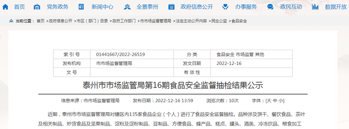 中国质量新闻网讯 近日,江苏省泰州市市场监管局发布第16期食品安全监督抽检结果公示。
