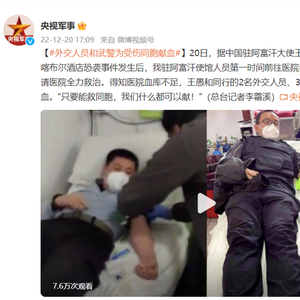 20日,据中国驻阿富汗大使王愚介绍,在阿富汗喀布尔酒店恐袭事件发生后,我驻阿富汗使馆人员第一时间前往医院看望受伤同胞并促请医院全力救治。得知医院血库不足,王愚和同行的2名外交人员、3名武警主动提出献血。“只要能救同胞,我们什么都可以献!”(总台记者李霜溪)