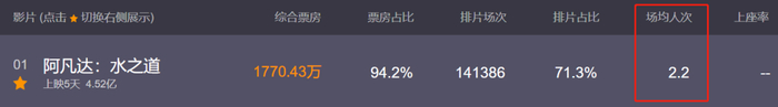 截止12月20日下午4时,上映五天的《阿凡达:水之道》票房为4.52亿元,远远低于市场预估表现。并且,猫眼电影数据显示,排片场次为141386场,而场均人次仅为2.2。