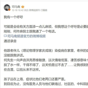司马南称,他与何祚庥院士通了电话。通话中何祚庥院士表示他跟老伴儿(理论物理学家庆成瑞)染疫病在家里,老伴的症状似更严重一些。何院士在通话中情绪低落,他说,他现在脱了水一样,干得不得了,这关怕是过不去了。而两人的孩子远在上海,症状比他们老两口还要严重。到目前为止,没有医务人员与他们联络过,小区的,中科院的,都没有。