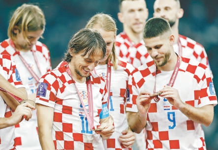 12月17日,2022年卡塔尔世界杯足球赛三、四名决赛中,克罗地亚队以2比1战胜摩洛哥队,获得季军。37岁的克罗地亚队球员莫德里奇(左)在颁奖仪式上。