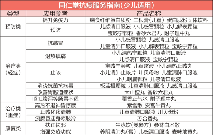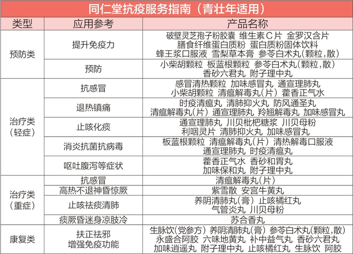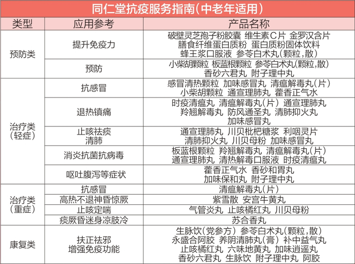 作为具有353年历史的中医药老字号品牌企业,新冠肺炎疫情暴发之初,同仁堂集团按照“防、抗、控、养”四位一体思路,筛选出80个疫情用药和9个提升免疫力的保健产品推向市场,受到大众欢迎。近日,根据疫情出现的新变化,同仁堂集团再次按照预防、治疗、康复阶段用药需求,聚焦抗感冒、退烧镇痛、止咳祛痰、消炎抗病毒等功效梳理出41个中成药、8个保健产品作为主打产品,服务首都群众抗疫,并制定了少儿版、中老年版和青壮年版《同仁堂抗疫服务指南》,指导群众合理用药。