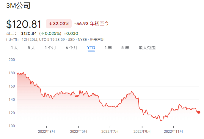 当然,这一消息对3M的股价显然并不利。3M股价周二收盘下跌约1.1%,而美国主要股指当天则小幅上涨。今年迄今,该公司股价已累计下跌了约32%,同期标普500指数跌幅则为20%。