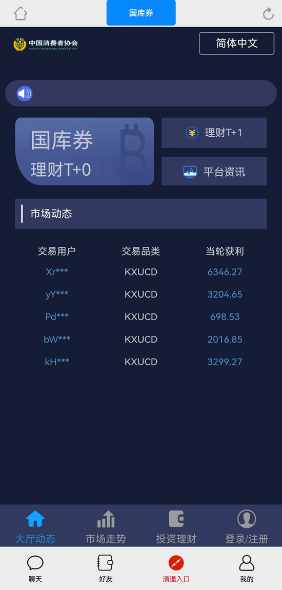 记者发现,该APP中的“清退入口”的确是一个伪装成国库券投资的平台,页面轮动展示部分用户的获利情况。此时一旦学员轻信,开始进行投资,损失就难以挽回了。