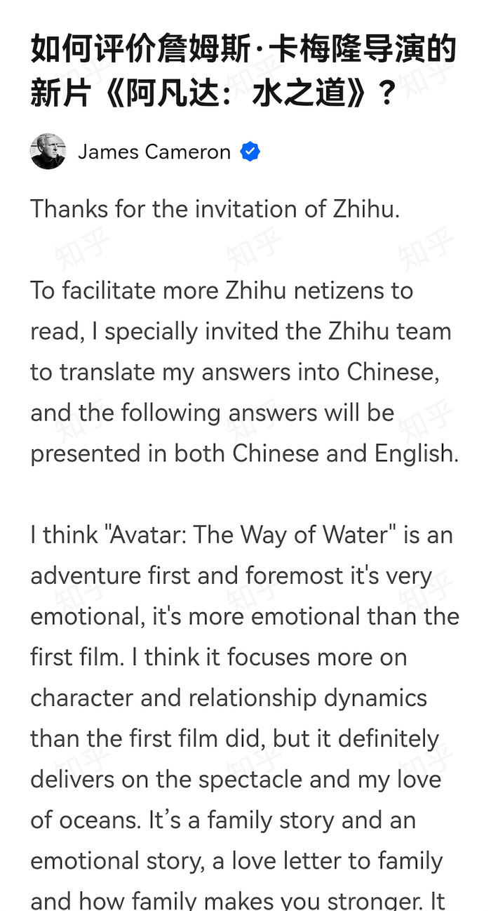 (原标题:导演卡梅隆在知乎亲自答:《阿凡达2》是一封写给家人的情书)