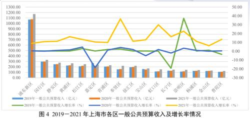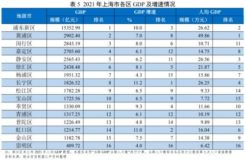 从GDP增速来看,2021年,上海市各区GDP呈现稳中有增的局面,浦东新区、长宁区和虹口区GDP增速超过10.0%,其余各区GDP增速在4.0%~9.3%,其中崇明区GDP增速处于全市最低水平4.0%。