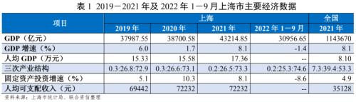 2022年1-9月,受疫情影响,上海市经济发展承受一定压力,上海市完成地区生产总值30956.65亿元,同比下降1.4%。其中,第一产业增加值55.74亿元,同比下降0.7%;第二产业增加值7822.08亿元,同比下降4.0%;第三产业增加值23078.83亿元,同比下降0.5%,三次产业占比分别为0.2:25.3:74.6。