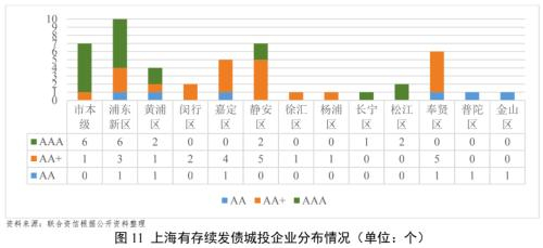 上海市存续发债城投企业主要分布在浦东新区、市本级和静安区,发债企业主体信用级别以AA+和AAA为主,整体资质较为优异。