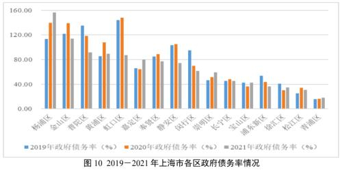 偿债能力方面,从各区整体偿债能力水平来看,截至2021年底,杨浦区政府债务率达156.18%、金山区亦超过110%,存在一定的偿债压力;普陀区、黄浦区、虹口区、嘉定区、奉贤区、静安区和闵行区债务率在60%~100%之间;崇明区、长宁区和宝山区处于40%~60%之间,偿债能力较强;浦东新区、徐汇区、松江区和青浦区政府债务率处于40%以下,偿债能力很强。从偿债能力变化趋势看,2021年杨浦区(增16.64个百分点)、嘉定区(增15.52个百分点)政府债务率增长较快,崇明区、宝山区、徐汇区和青浦区债务率小幅增长,其余各区政府债务率均呈现不同程度的下降。其中,虹口区债务率下降幅度最大,达61.11个百分点,主要系政府性基金收入大幅增长所致;其次依次为静安区(政府债务规模收缩和政府性基金收入增长)、普陀区(政府性基金收入增长)和金山区(政府性基金收入和上级补助收入增长),较上年底下降25~31个百分点;其余各区债务率降幅在20个百分点以下。