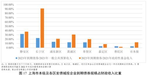 从即期债务保障能力来看,以城投企业2023年到期债券规模占一般公共预算收入或政府性基金收入的比重来衡量一般公共预算收入或政府性基金收入对到期债券的支持保障能力,支持保障能力较强的区域为嘉定区、市本级和普陀区,支持保障能力相对一般的区域为静安区、长宁区和黄浦区。