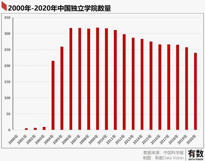 根据中国科学报的统计,中国独立院校在2004年猛增,从2003年的9所暴增至215所。独立学院培养的学生,一度占整体大学生的三成以上。
