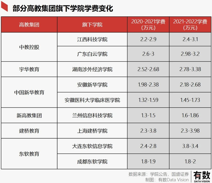 例如民生教育旗下的重庆应用技术职业学院和内蒙古丰州职业学院是大专,上海建桥学院是建桥集团麾下的三本院校,江西科技学院和广东白云学院则是都是中教控股旗下的二本。