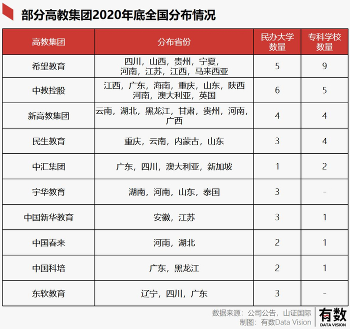 与之类似,所谓“高教集团”,指手中拥有合法合规能够被认证的,能够发放高等教育文凭院校的商业机构。在中国香港上市的22家高教集团,旗下各类学校覆盖了全国24个省级行政区,从大专到二本覆盖面不一。如果算上还未上市的,覆盖面可能会更多。