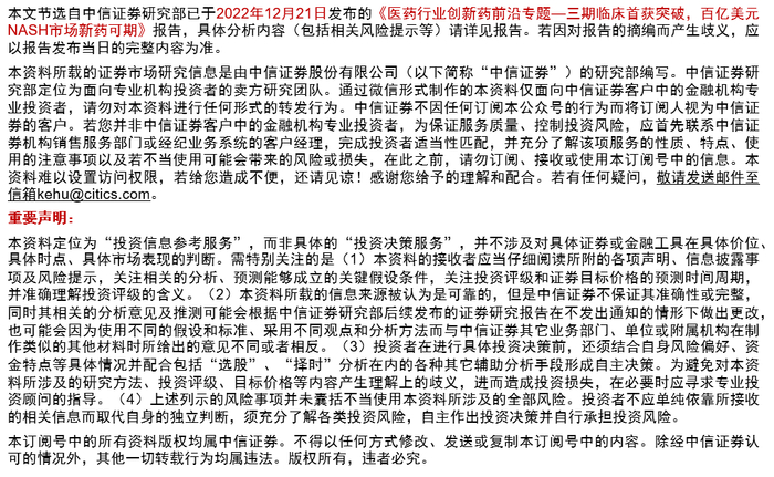 1)12月甲状腺激素受体β(THR-β)选择性激动剂Resmetirom治疗NASH的III期临床达到主要终点和关键次要终点,成为NASH领域首个成功的III期临床。据Madrigal披露,公司计划在2023年下半年向FDA提交NDA申请,寻求Resmetirom的加速批准。