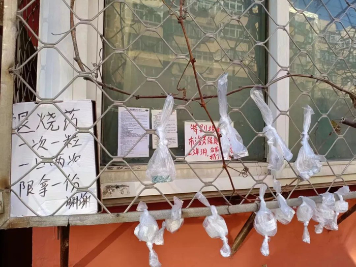 老旧的防盗窗绑着许多袋子,每袋装着几片退烧药……