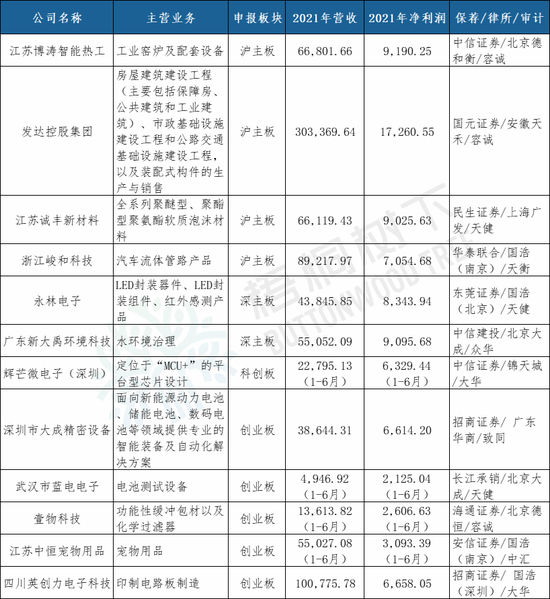 12家IPO终止企业中,4家申报的是上交所主板,2家申报深交所主板,1家科创板,5家创业板。此外,该12家企业中,仅有1家企业2021年度净利润过亿,为发达控股集团,2021年净利润为1.73亿元。