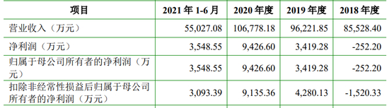 2018年、2019年、2020年及2021年1-6月,公司营业收入分别为8.55亿元、9.62亿元、10.68亿元及5.50亿元。扣非归母净利润分别为-1,520.33万元、4,280.13万元、9,135.36万元及3,093.39万元。