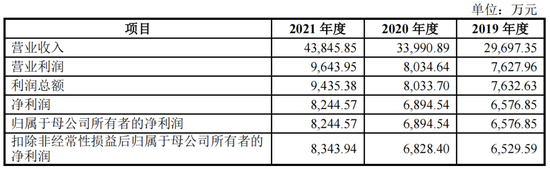 2019年、2020年及2021年,公司营业收入分别为2.97亿元、3.40亿元及4.38亿元。扣非归母净利润分别为6,529.59万元、6,828.40万元及8,343.94万元。