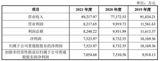 2019年、2020年及2021年,公司营业收入分别为9.18亿元、7.72亿元及8.92亿元。扣非归母净利润分别为9,918.13万元、7,510.56万元及7,054.68万元。