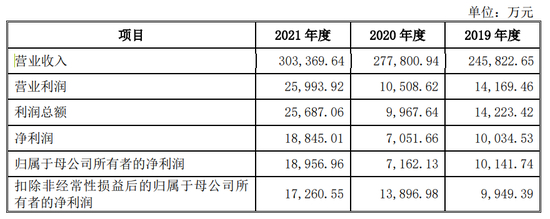 2019年、2020年及2021年,公司营业收入分别为24.58亿元、27.78亿元及30.34亿元。扣非归母净利润分别为0.99亿元、643.43万元、1.39亿元及1.73亿元。