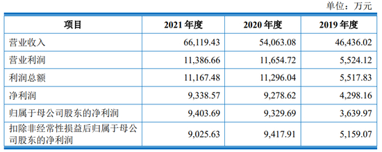 2019年、2020年及2021年,公司营业收入分别为4.64亿元、5.41亿元及6.61亿元。扣非归母净利润分别为5,159.07万元、9,417.91万元及9,025.63万元。