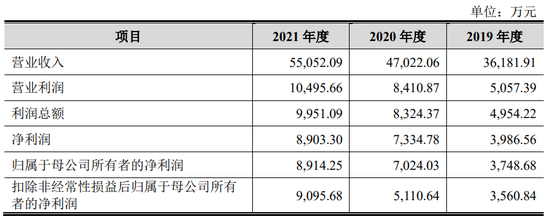 2019年、2020年及2021年,公司营业收入分别为3.62亿元、4.70亿元及5.51亿元。扣非归母净利润分别为3,560.84万元、5,110.64万元及9,095.68万元。