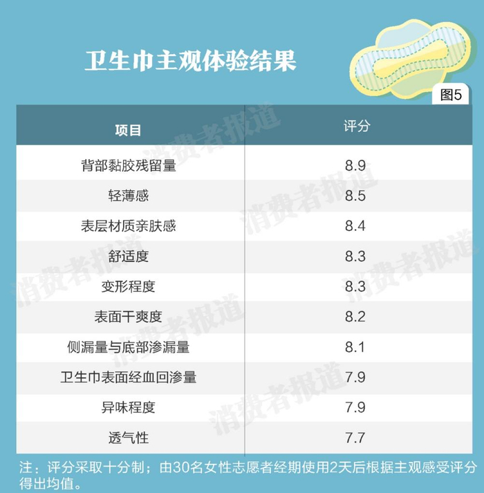 本刊招募了30名此前未使用过液体卫生巾的女性志愿者,对此款液体卫生巾进行了主观试用,测试项目包括卫生巾表面经血回渗量、表面干爽度、侧漏量与底部渗漏量、透气性、表层材质亲肤感、轻薄感、舒适度、异味程度、变形程度及背部黏胶残留量等10个方面。