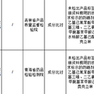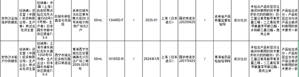 通报显示,产品标签标示为株式会社资生堂生产、资生堂(中国)投资有限公司经销的“安热沙金灿倍护防晒乳”经吉林省产品质量监督检验院检验,成分比对不符合规定,未检出产品标签及注册资料载明的技术要求标示的防晒剂:双-乙基已氧苯酚甲氧苯基三嗪、二乙氨羟苯甲酰基苯甲酸己酯、水杨酸乙基己酯、奥克立林。“安热沙水能户外防晒乳”成分比对不符合规定,未检出产品标签及注册资料载明的技术要求标示的防晒剂:双-乙基已氧苯酚甲氧苯基三嗪、二乙氨羟苯甲酰基苯甲酸己酯、奥克立林。