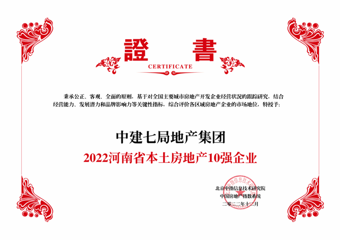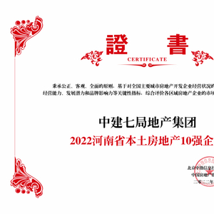中建七局地产集团凭借在河南省良好的市场表现被评为“2022河南省本土房地产10强企业”、“2022郑州市房地产市场地位领先企业”。